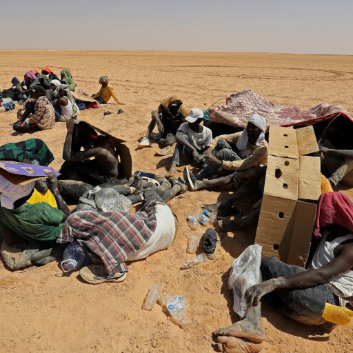 Des migrants subsahariens abandonnés dans le désert à la frontière entre la Tunisie et la Libye, le 16 juillet 2023. © Mahmud Turkia/AFP/Getty Images
