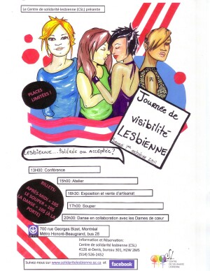 Le Centre de solidarité lesbienne présente la journée de visibilité lesbienne qui aura lieu samedi 1er octobre à 13h. Cette journée sert à donner la place aux femmes qui aiment les femmes. La thématique de cette année est lesbienne...tolérée ou acceptée ?